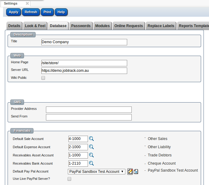 Go to Admin/Settings menu, Database tab, you can find the Default Pay Pal Account dropdown and Use Live PayPal Server checkbox in Financials section.